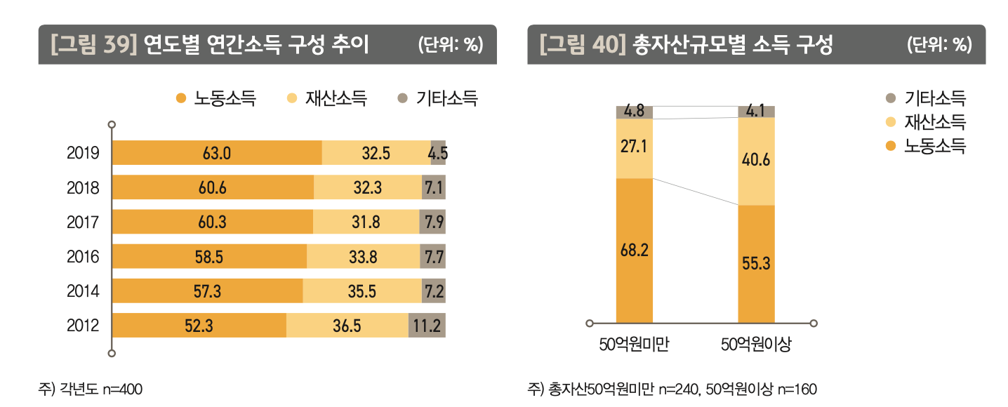 8. 부자들의 연간 소득은 평균 2억 2천만 원이며, 이중 노동소득 비중은 63%, 재산소득 비중은 32.5%를 차지한다.
