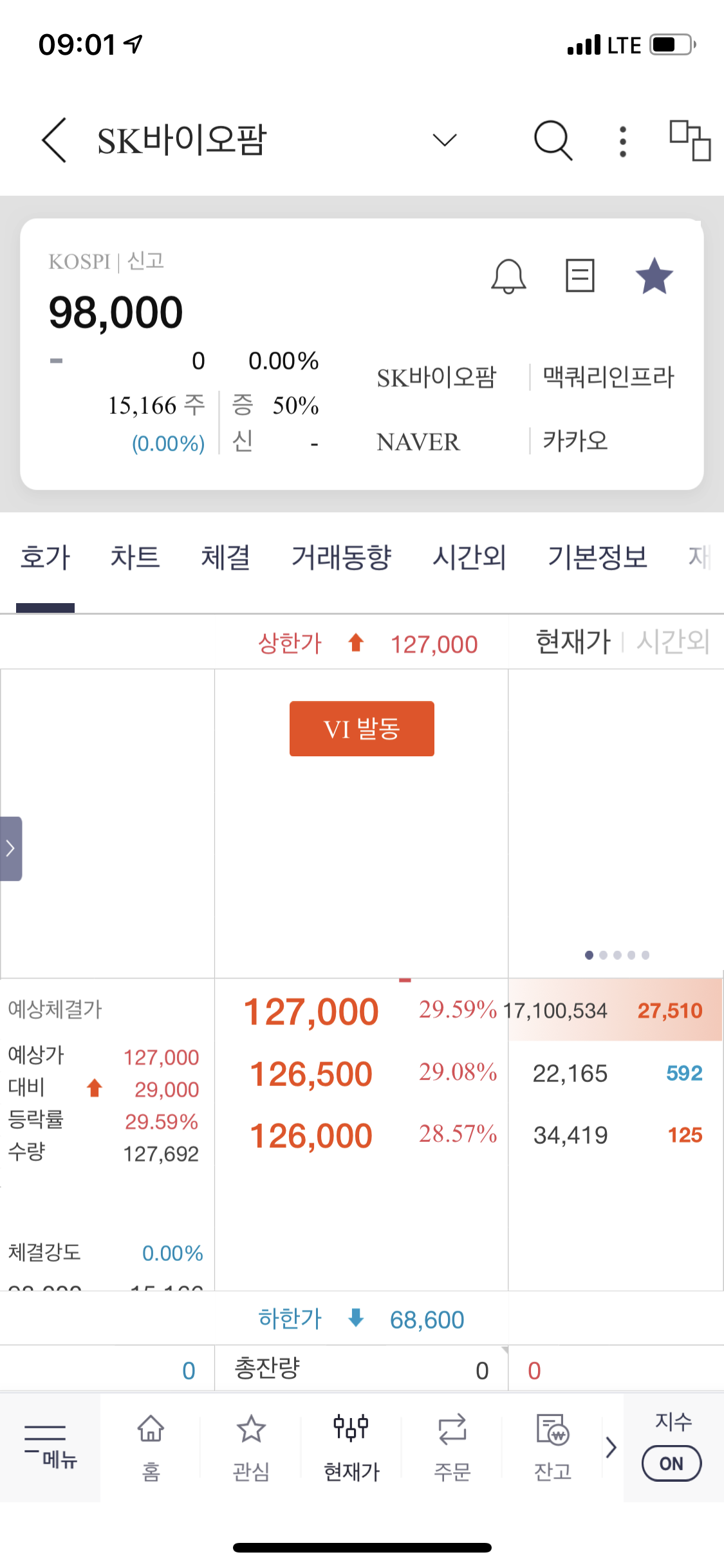 VI발동. (이론적으로 보면 상한가를 가는 종목은 반드시 VI를 거쳐야 합니다.)