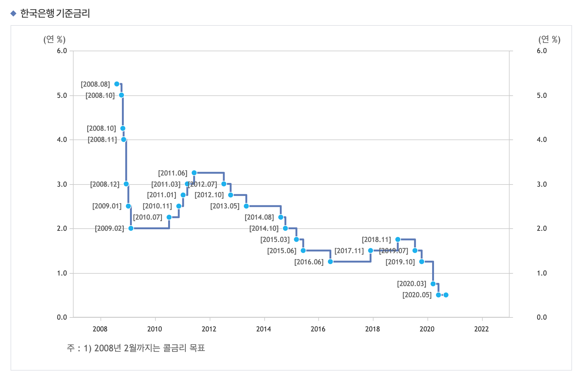 실제로 그래프를 보면, 지금 한국은행 기준금리가 얼마나 낮은지 알 수 있습니다.