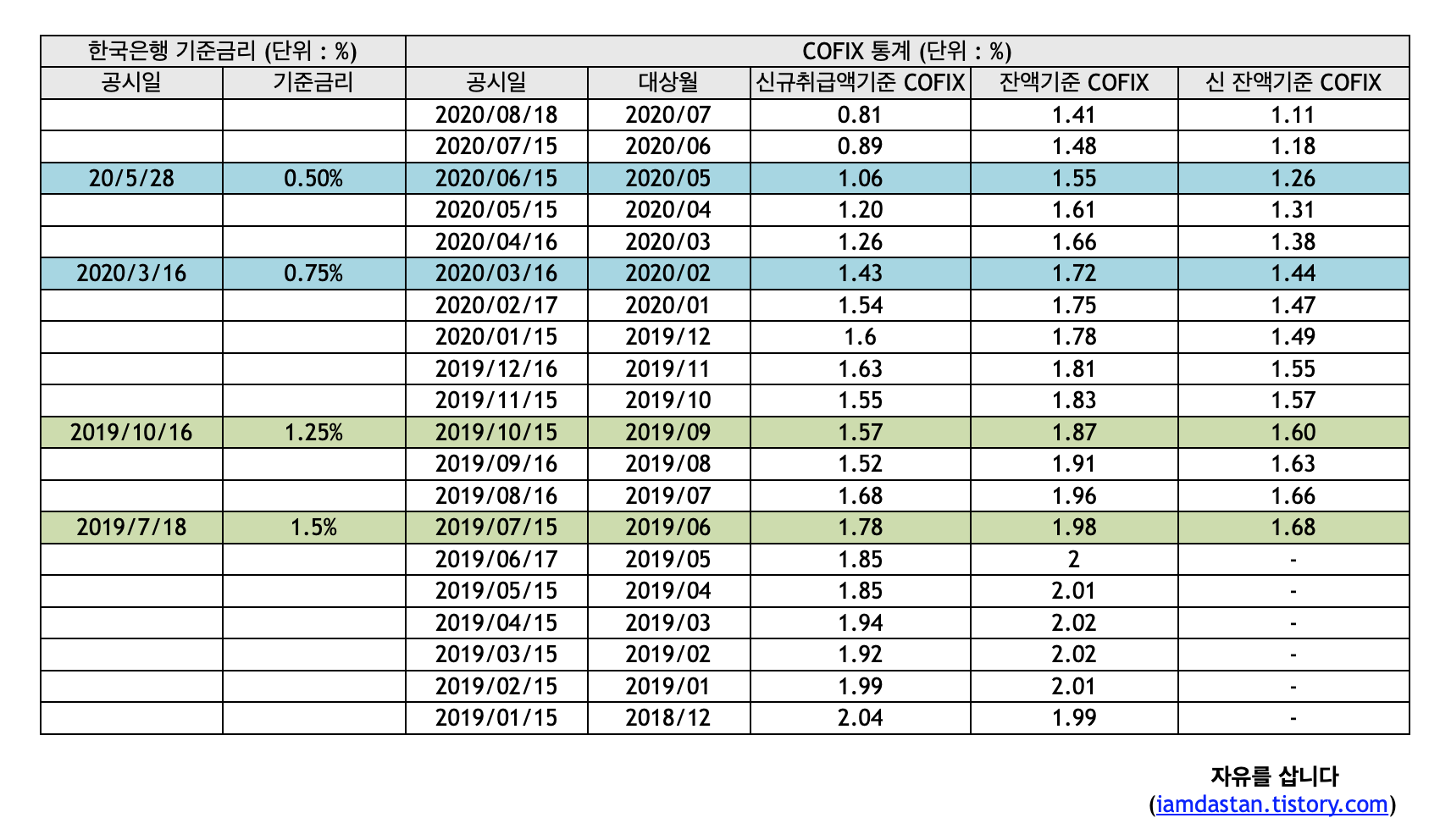 오랜만에 COFIX금리와 한국은행 기준금리를 체크해봤습니다.