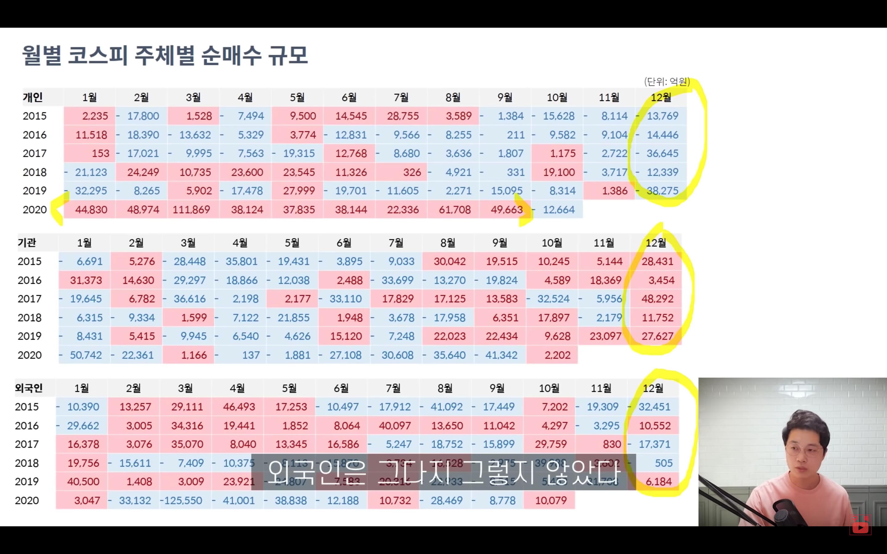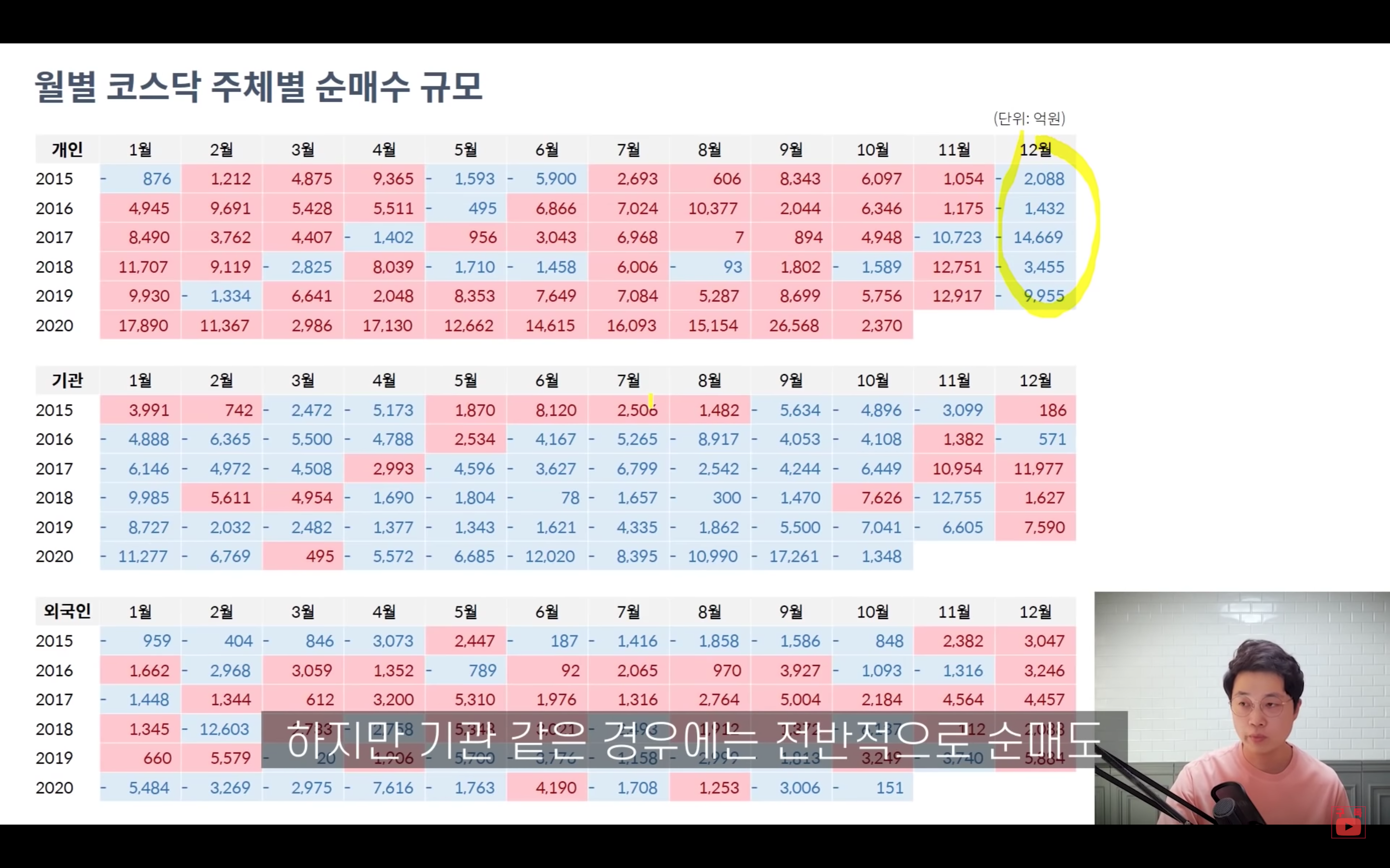 그리고 코스피, 코스닥 모두 개인은 늘 12월에 순매도, 기관은 순매수였다는 것을 알 수 있습니다.