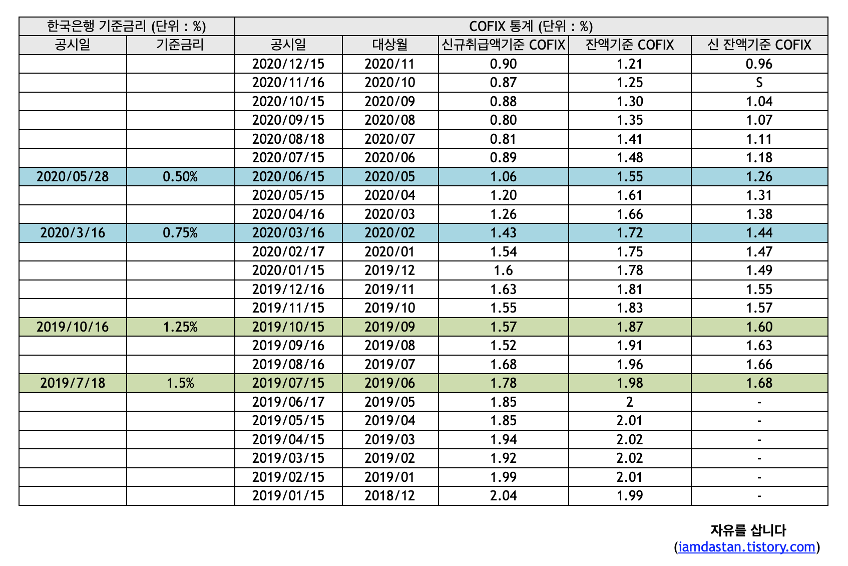 한국은행 기준금리만으로 보면 2019년 7월 18일 1.5%에서 2020년 5월 28일 0.5%(역대 최저금리)로 1/3이 되었고, 코픽스 금리 또한 2019년 7월 18일 1.78%에서 2020년 12월 15일 0.90%로 반토막이 되었습니다.