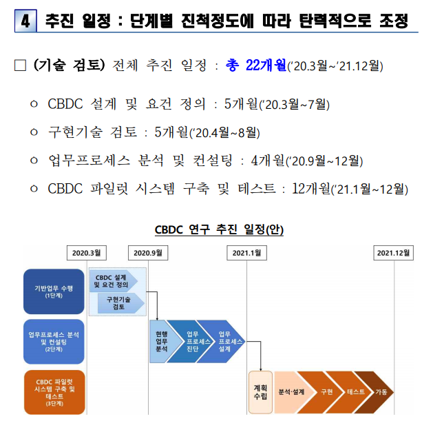 * (2021.7.20) 당초 2021년 4월 예정이었던 공고가 2021년 6월 말까지 지연되었으며, 2021년 7월 드디어 '그라운드X'가 CBDC 파일럿 시스템 구축 및 테스트 사업 우선협상대상자로 최종 선정